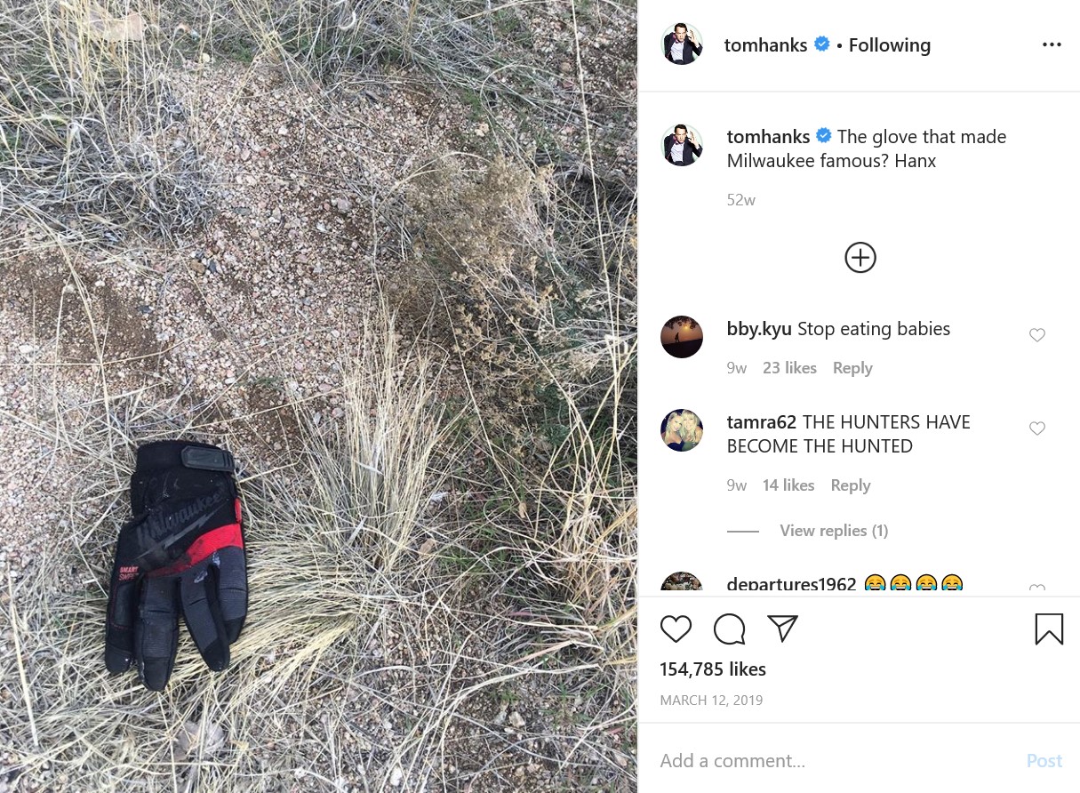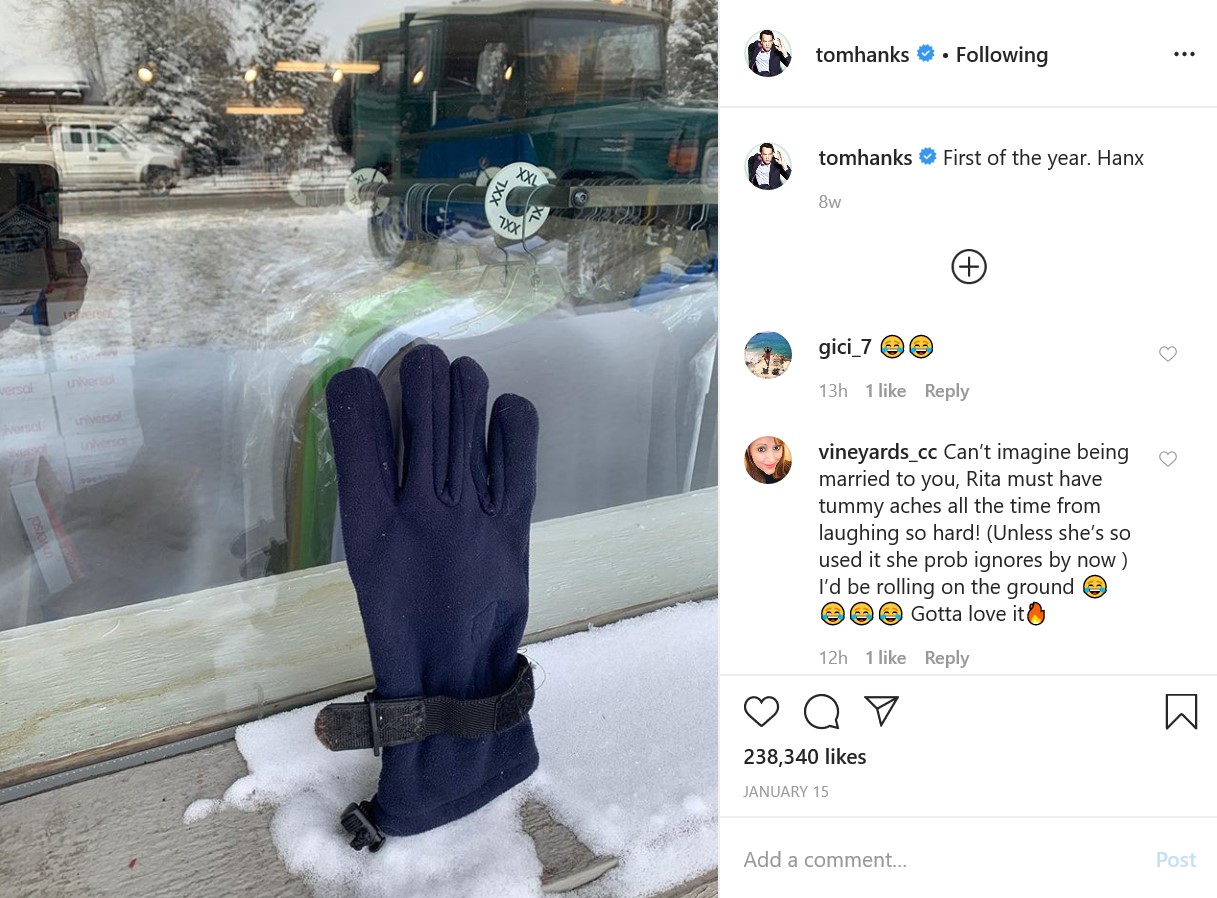 Фотографіями рукавичок Хенкс одержимий вже не перший рік. Варто акторові зустріти на своєму шляху загублену кимось рукавичку, вона одразу ж з'являється на його сторінці в соцмережі. Чи то рукавичка лижника, чи будівельника. У них, як зізнавався раніше актор, він бачить відмінну метафору міської самотності.