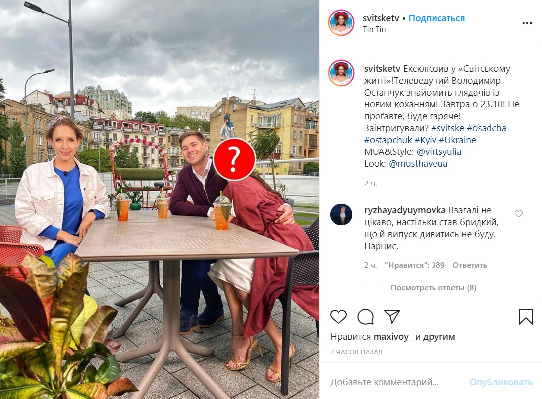 За словами Осадчої, ведучий вперше після розлучення вирішив офіційно познайомити її глядачів з обраницею, і бесіда з парою буде гарячою. Але заінтригувати вдалося не всіх. У коментарях під постом багато глядачів передачі зареклися дивитися інтерв'ю, назвавши ведучого "неприємним нарцисом".