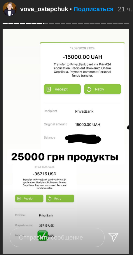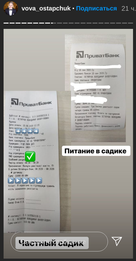 Також Остапчук показав скріншоти і чеки, що підтверджують виплати Олені Войченко і за харчування в дитячому саду у вересні 2020 року.