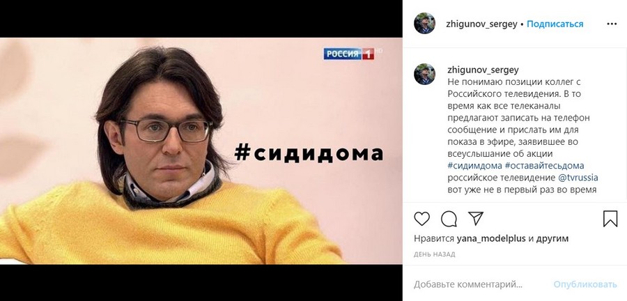 За словами Жигунова, у дні карантину він продовжує отримувати дзвінки від представників популярних телевізійних шоу, які не припинили зйомки: "Спочатку лунає дзвінок з передачі Корчевніковим, вчора був дзвінок з програми Малахова <...> у відповідь на питання "А як же самоізоляція?" пробурмотіли щось невиразне, від чого залишився осад", - написав він у Інстаграм.