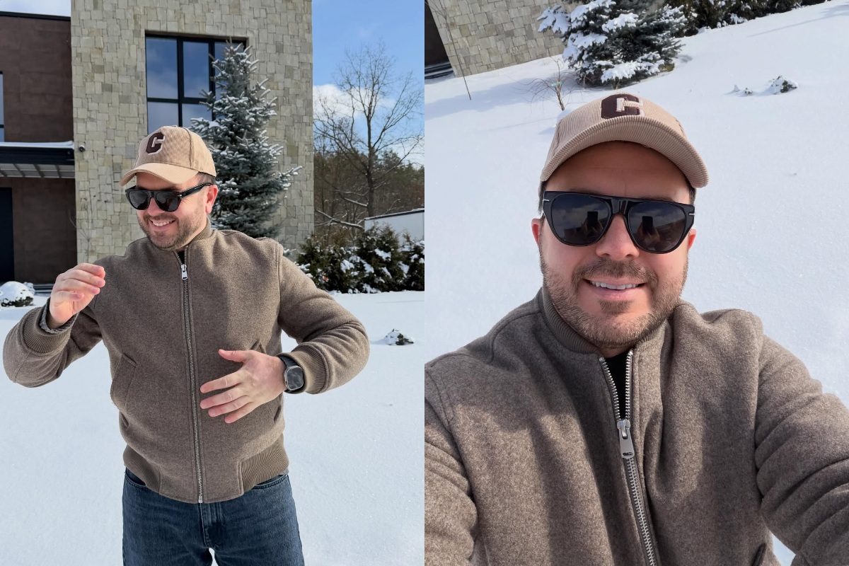 Щасливий чоловік сфотографувався на тлі дому у повсякденному образі. Для фотосесії він обрав сніжний день, коли навкого біло-біло.