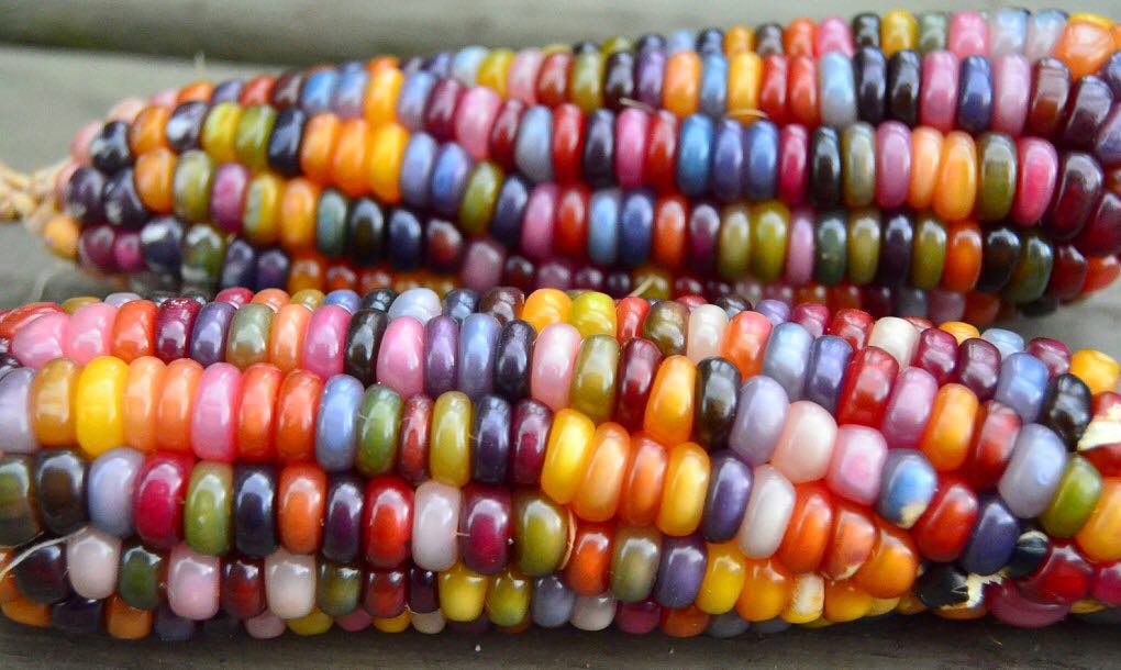 Кольорова кукурудза. Якщо ви думаєте, що ці початки пофарбували якимись харчовими барвниками, ви дуже сильно помиляєтеся. Така унікальна кукурудза називається Glass Gem, і є дуже древнім сортом. Правда, зварити і з'їсти її не вийде, з цього сорту роблять борошно і попкорн, але не використовують його для варіння і готування страв.
