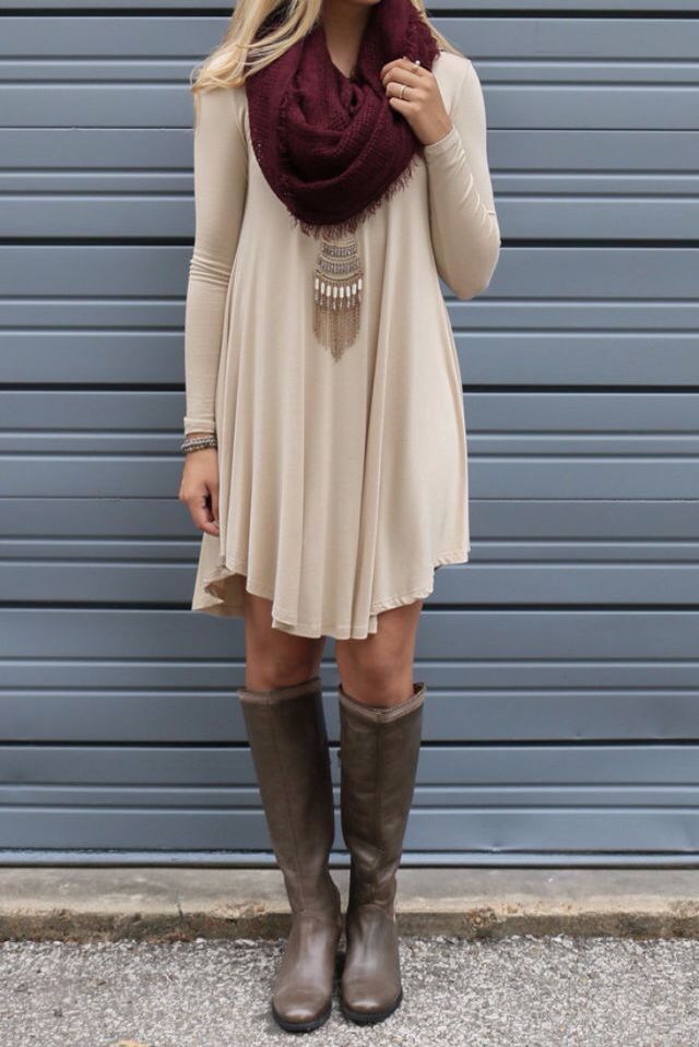 Ідеальний варіант для прохолодної осені - сукня з м'якої приємною тканини, шарфик або накидка і високі чоботи. Таке вбрання буде не тільки модним і стильним, але і допоможе вам не замерзнути під час перших прохолодних вечорів. Також доповнити образ можна короткою курточкою або тренчем і аксесуарами в стилі бохо.