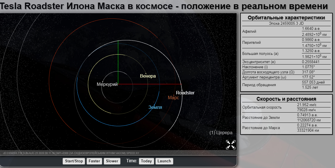 Як би там не було, прямо зараз автомобіль все ще їздить по безкрайньому всесвіту. В даний момент він обертається по траєкторії, яка перетинається з орбітами Землі та Марса. Точне місце розташування Tesla з усіма координатами можна дізнатися на спеціальному сайті.