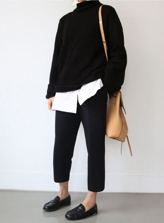 Ви точно будете виглядати стильно цієї осені, якщо виберете образ з темними брюками, білою сорочкою, светром оверсайз і лоферами.
