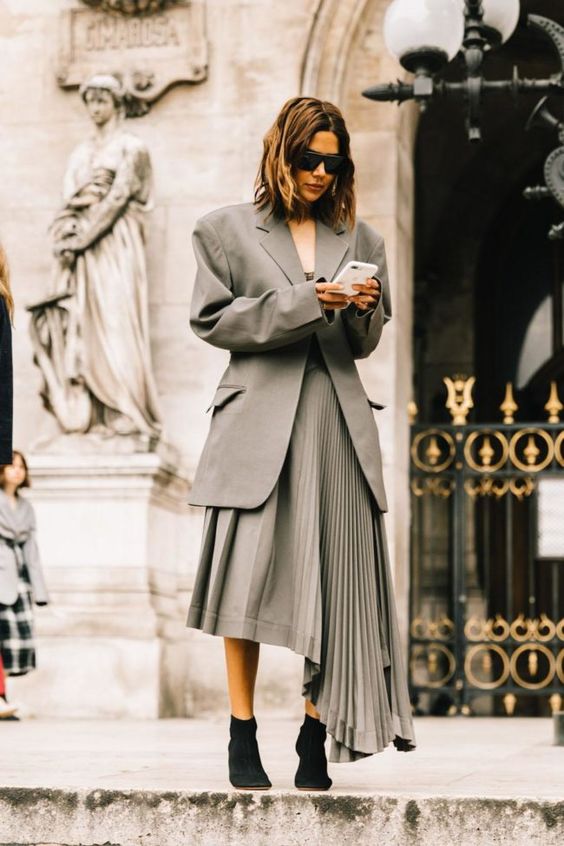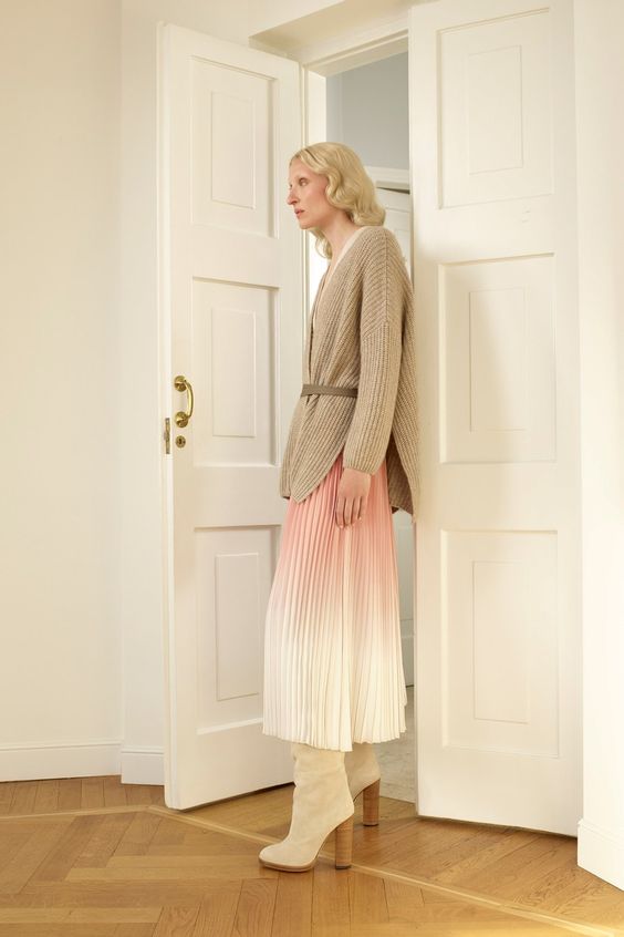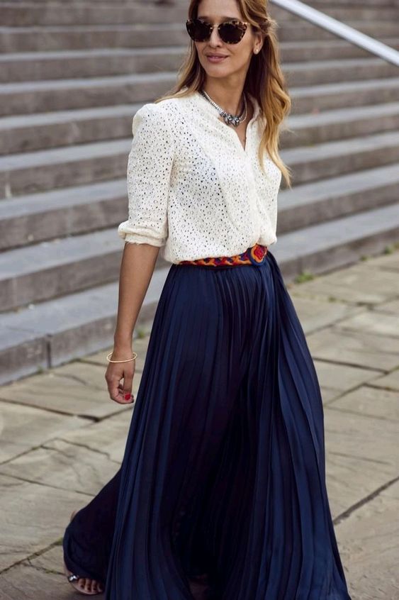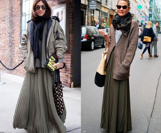 Плісировані спідниці довжини максі найчастіше носять влітку, проте якщо на вулиці суха погода - надіти її можна і восени. Доповнити лук можна теплим кардиганом або курткою оверсайз.