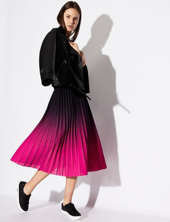 Ще один варіант спідниці плісе - з красивим переходом кольору під назвою "деграде" або омбре. Такий варіант спідниці можна надіти як із косухою і кросівками, так і з довгим кардиганом і чобітками на високому каблуці.