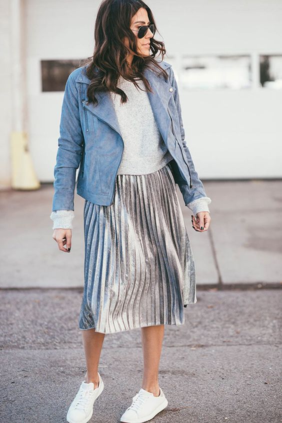 Актуальними є також спідниці плісе з металевим блиском - такий образ можуть доповнити кеди або кросівки і яскрава косуха або утеплена джинсівка.