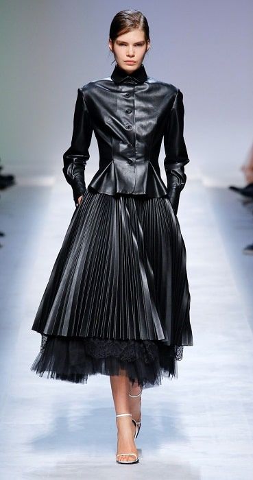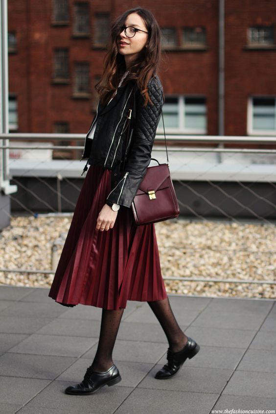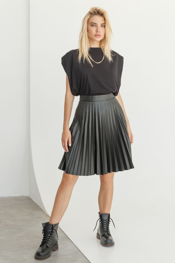 Спідниця плісе зі шкіри або еко-шкіри також стане незамінною річчю в осінньому гардеробі. Чудовим буде поєднання як з косухою і лоферами, так і з грубими черевиками.