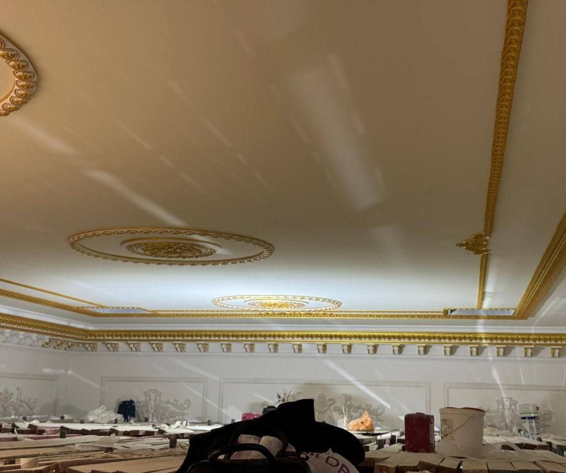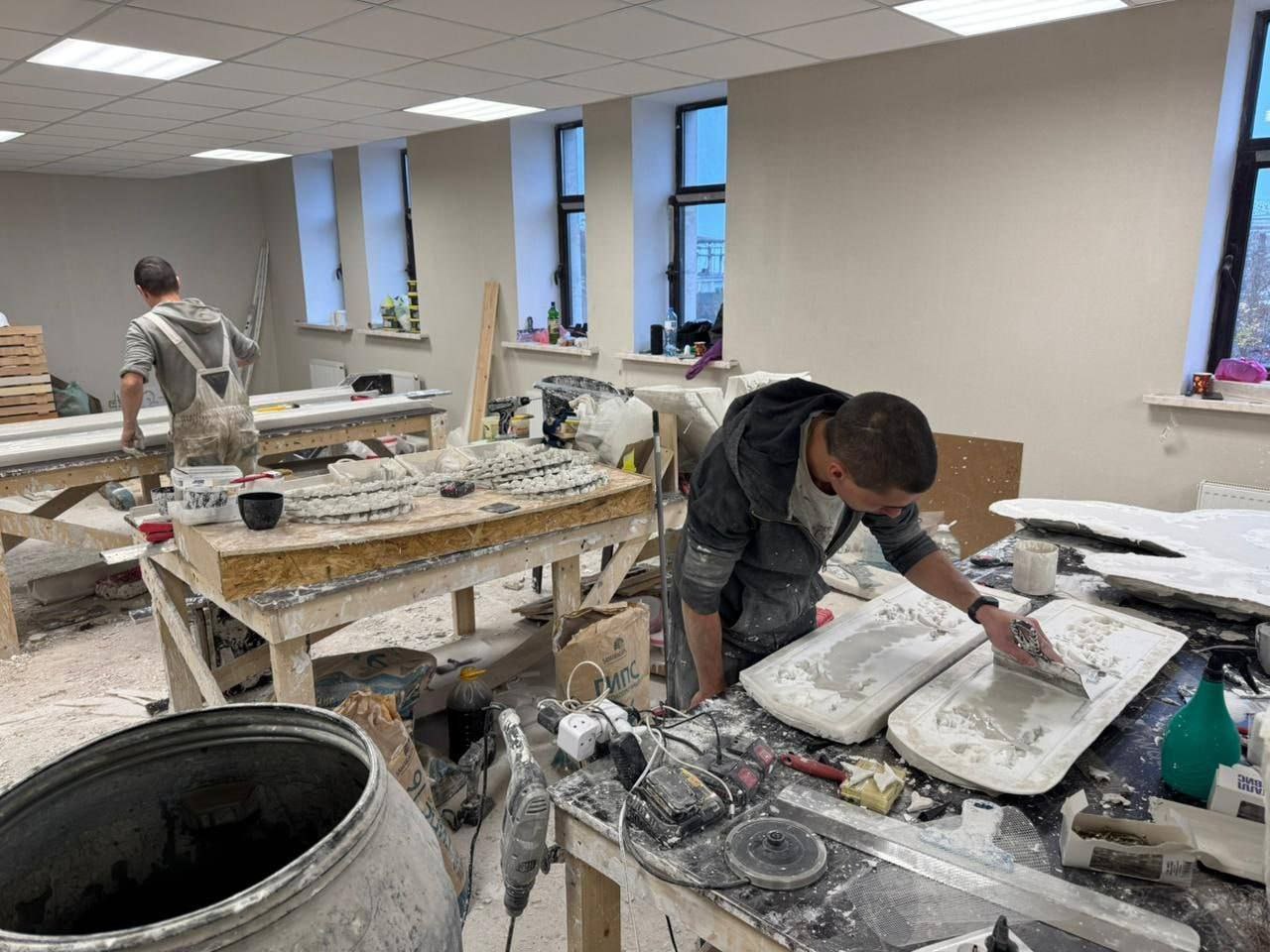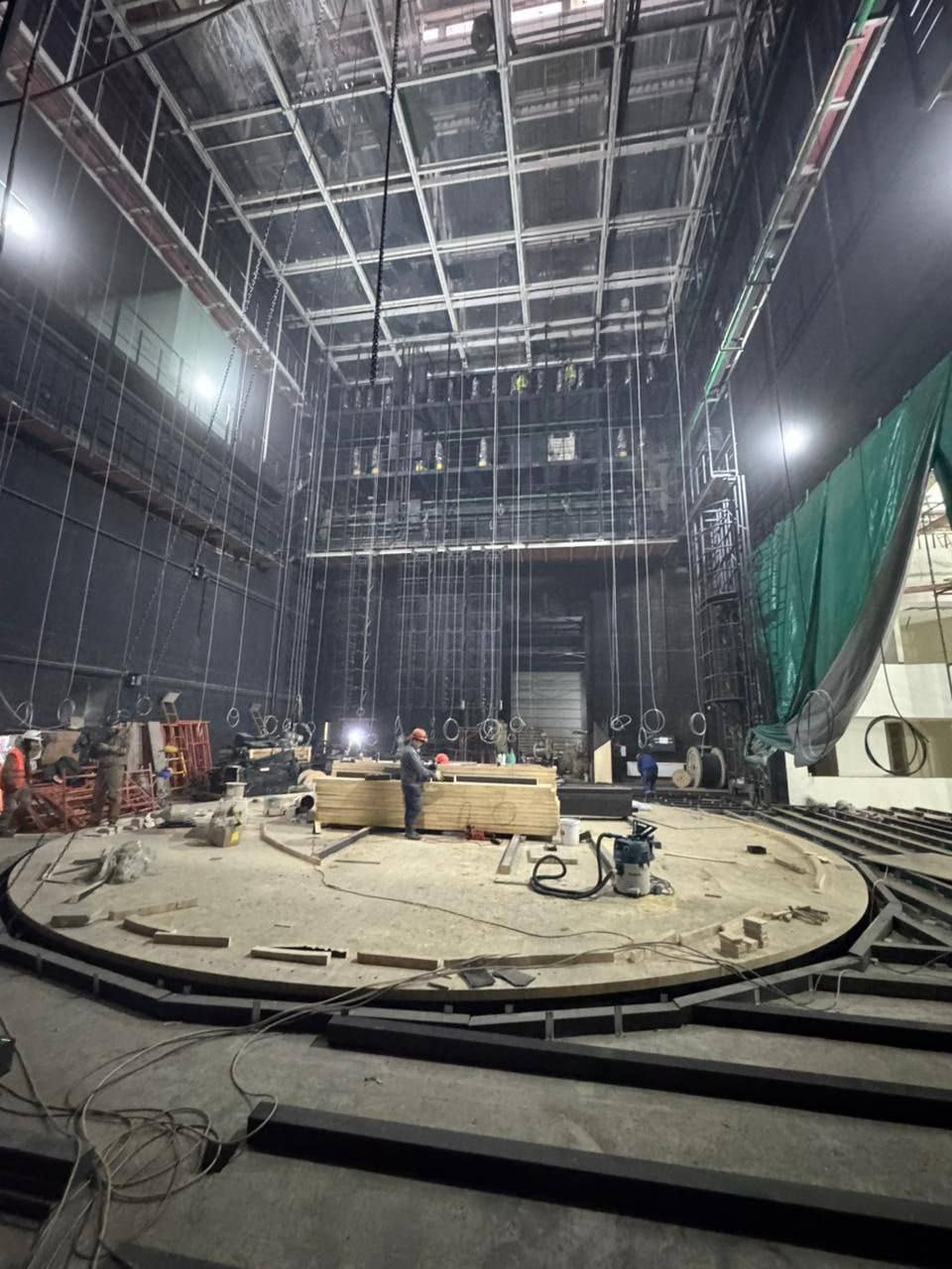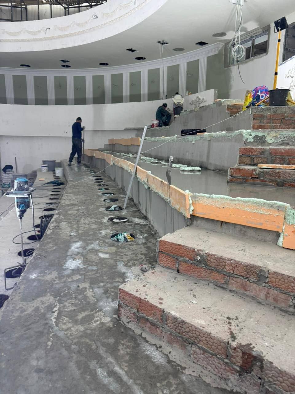 Російські окупанти на фінальному етапі "відновлення" Маріупольського драмтеатру, зруйнований під час бомбардування. Загарбники доробляють сцену та глядацький зал.