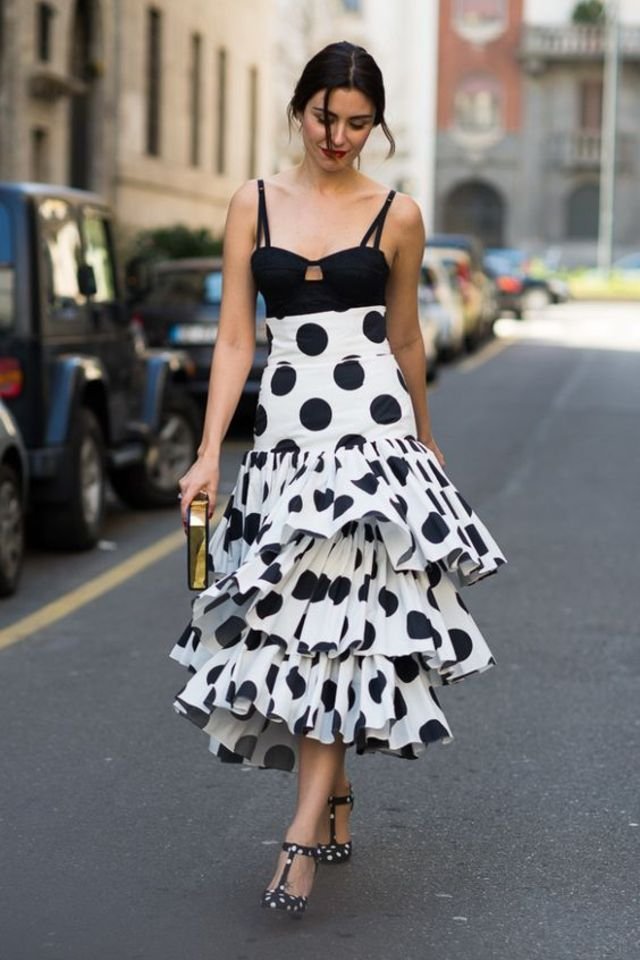 Чорно-білі сукні в горох - ще один тренд цього літа. Найкраще вони виглядають з солом'яними капелюхами і симпатичними сумочками. В якості взуття підійдуть класичні човники або босоніжки.