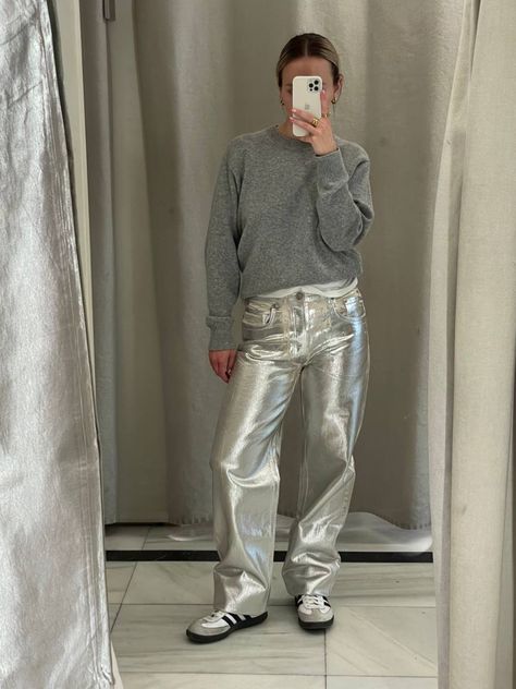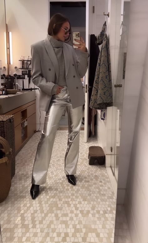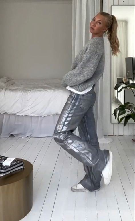 Це чудовий варіант вбрання для прохолодних осінніх та зимових днів. Скомбінуйте джинси металік з улюбленим джемпером під горло, додайте піджак розміру оверсайз, а також трендове взуття. Для особливої вишуканості можете додати сонцезахисні окуляри.
