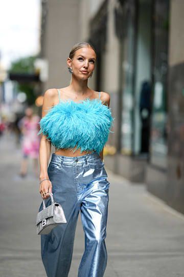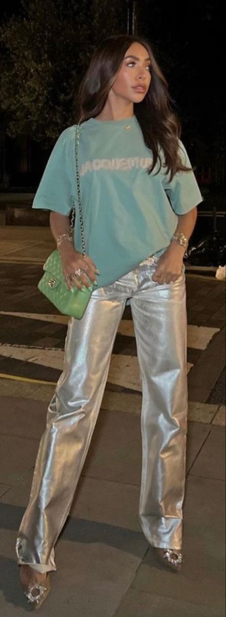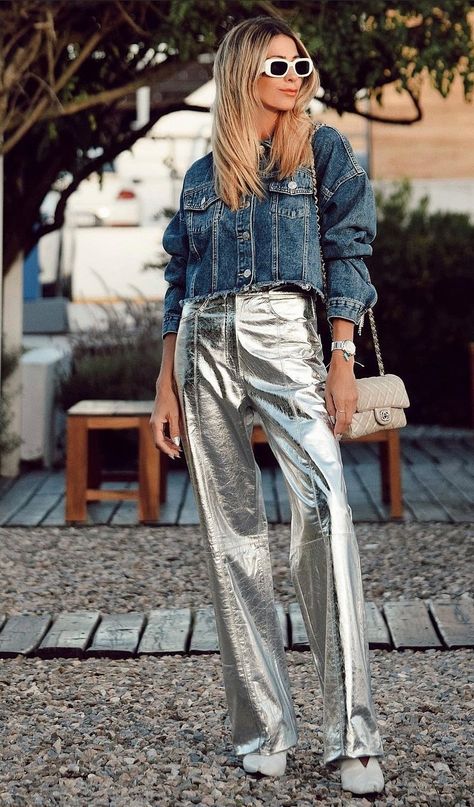 Якщо хочете поекспериментувати та спробувати щось нове для себе в моді, додайте до блискучих джинсів об'ємний сміливий топ, наприклад, як показано на знімку нижче. Також не забудьте про аксесуари, вдалий макіяж та маленьку сумочку, яка завершить образ.