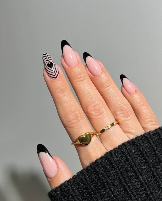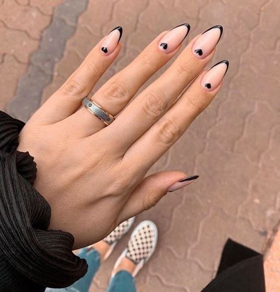 Ще один варіант – доповнити чорний френч малюнками, наприклад, геометричними фігурами або сердечками, біля основи нігтя.