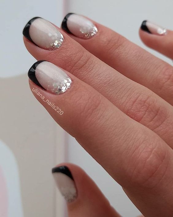 Також можна поекспериментувати та урізноманітнити чорний френч блискітками біля основи нігтя.