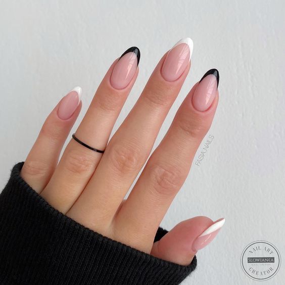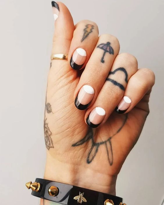 Ще один варіант – поєднати в одному манікюрі чорний френч та місячний манікюр. Місячний манікюр – один з базових варіантів дизайну, при якому основа нігтя (її часто називають просто лункою) виділяється іншим кольором або залишається незакрашеною.