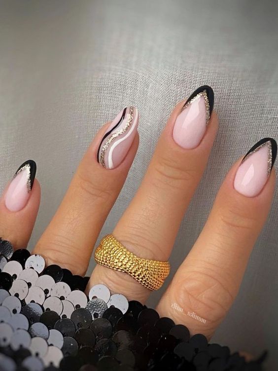 Також чорний френч можна урізноманітнити хвилястим манікюром на одному з нігтів. Особливо стильно такий дизайн виглядатиме на довгих нігтях мигдалеподібної форми.