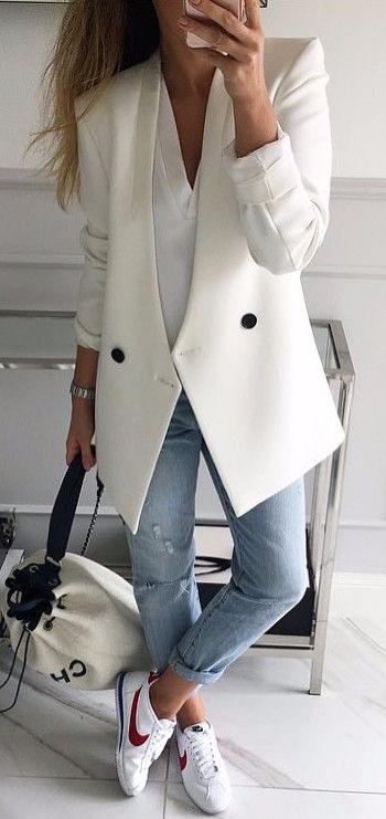 Окрема модна фішка сезону - однотонні піджаки білого, бежевого, кремового, пудрового та інших подібних кольорів. Така деталь одягу виглядає одночасно і по-діловому, і романтично. Тому підійде як для офісу, так і для побачення.