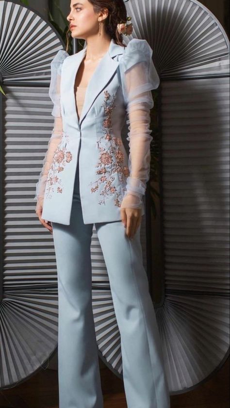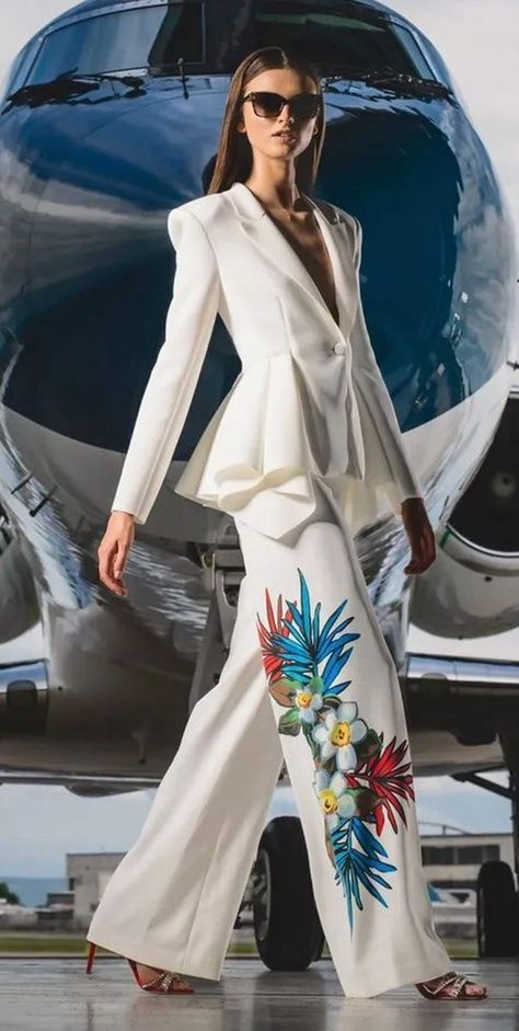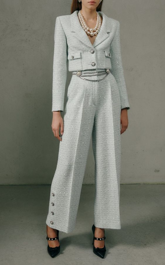 Коли ж бажаєте зберегти ефектність і стриманість одночасно, зверніть увагу на наступний варіант. Оберіть класичний білий піджак і додайте до нього штани з легкої тканини, які по всій довжині оздоблені камінчиками та яскравими деталями.
