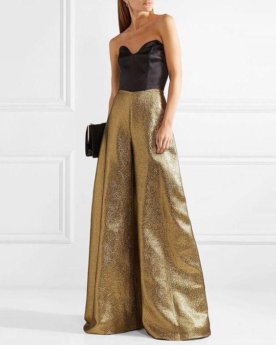 Якщо ж бажаєте на випускному бути в центрі уваги, придивіться до вбрання на фото нижче. Брюки насиченого золотого чи іншого відтінку у поєднанні з корсетом базового кольору - вдала комбінація, яка створить неперевершений образ. Додайте клатч та прикраси, які вважатимете підходящими.