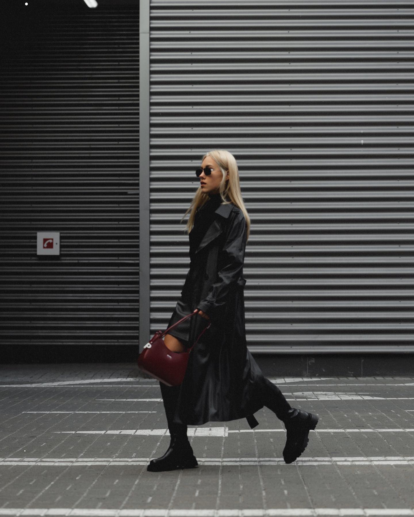 Другий осінній лук Даша Квіткова склала з чорним шкіряним пальто з відкладним коміром. Вийшов стильний total black look, що складається з короткої спідниці з розрізом, светра-водолазки, ботфортів на масивній підошві та довгого пальта. Розбавити образ вона вирішила маленькою сумкою бордового відтінку.