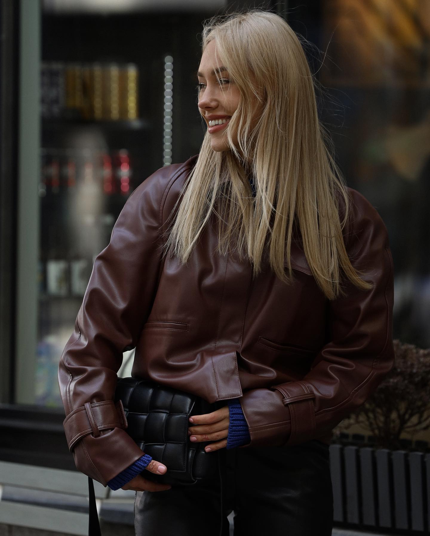 Для стильного осіннього образу інфлюенсер вибрала шкіряну куртку насиченого коричневого відтінку. Свій лук вона доповнила злегка розкльошеними штанами зі штучної шкіри чорного кольору, сумкою крос-боді та ботильйонами на підборах та з вузьким носком.