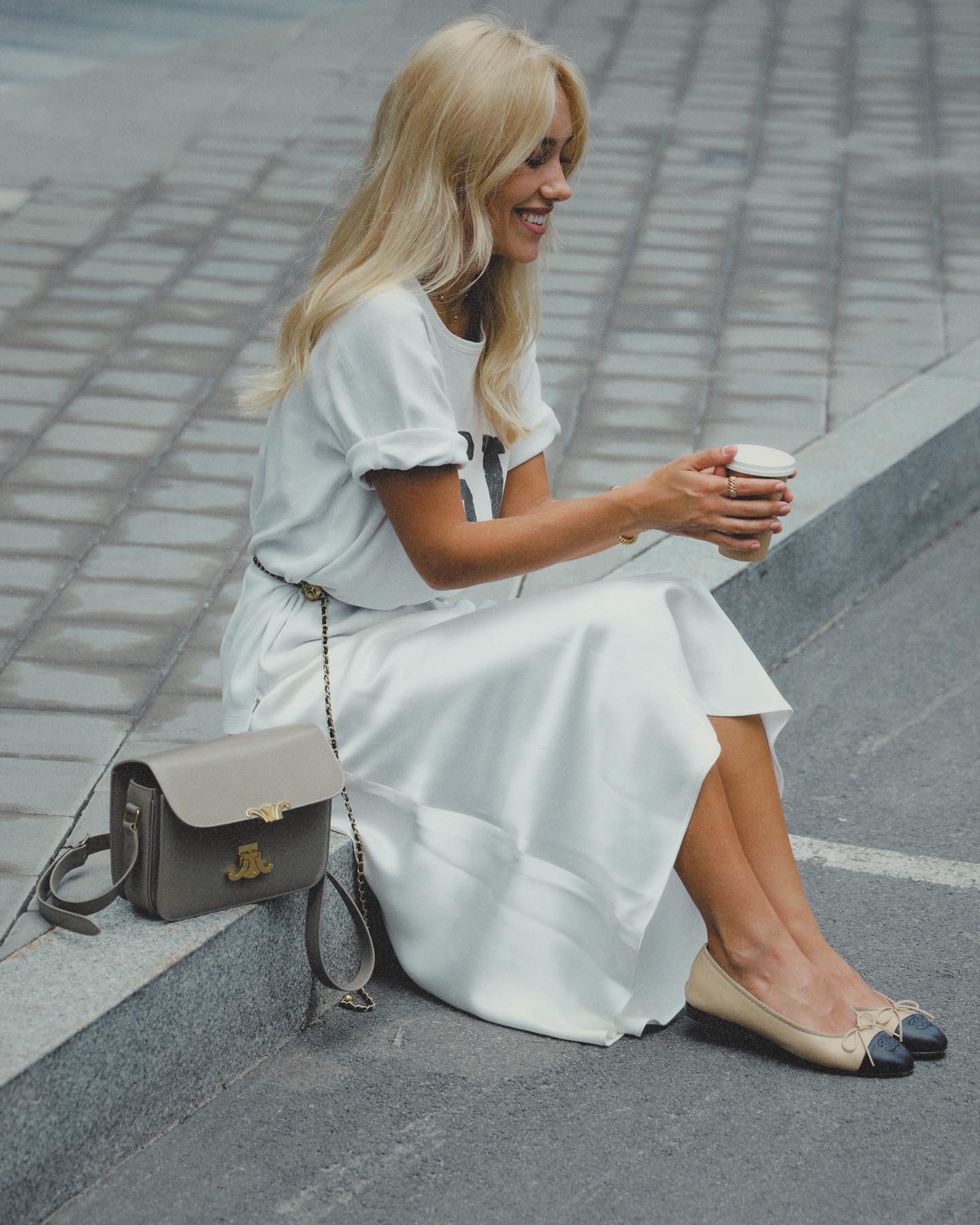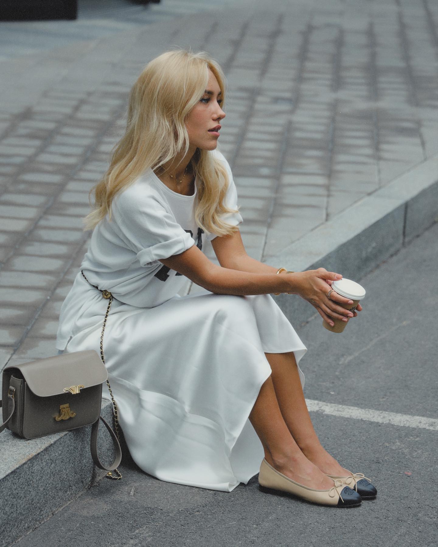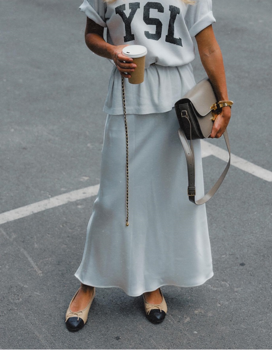 Так, днями вона опублікувала стильний літній лук із трендовими балетками. Даша Квіткова постала у довгій атласній спідниці кольору слонової кістки та футболці оверсайз із написами, яку вона оригінально обіграла, підкресливши лінію талії тонким ременем із ланцюгів. Свій образ вона доповнила невеликою сумкою відомого бренду, непомітними прикрасами, а також бежевими балетками з чорним носком та бантиком.