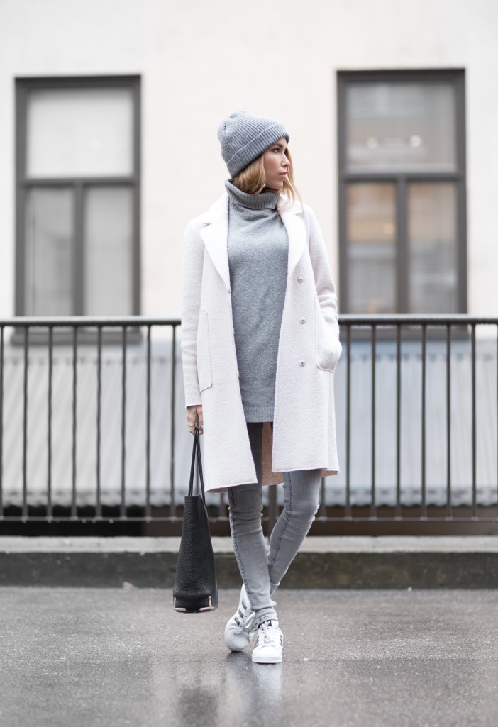 Світле пальто - деталь, яка завжди виглядає дуже ефектно і жіночно. Носити такий елемент гардеробу найкраще з сірими, пастельними, нюдовими або кавовими відтінками. Білі кросівки теж будуть мати гарний вигляд з подібним образом.