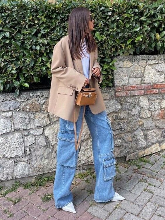 Ще одне сміливе поєднання – джинси карго та піджак. Доповнити такий образ можна як зручними кросівками, так і оригінальними босоніжками на підборах.