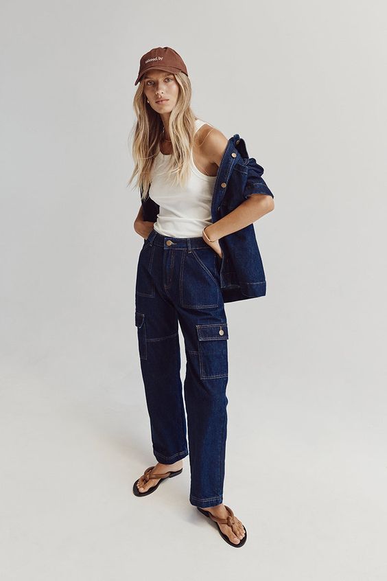 Для прохолодного літнього дня можна приглянути темно-сині джинси карго. Такі штани можна доповнити білою майкою, джинсовою курткою, а також шльопанцями та кепкою-бейсболкою.
