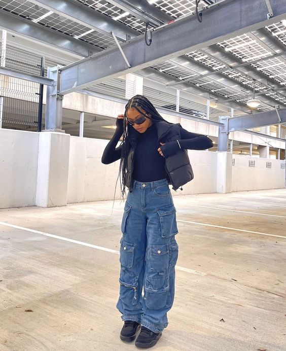 Такий фасон джинсів також поєднується з гольфами-водолазками. Одягайте джинси карго з накладними кишенями, чорну водолазку, а зверху накиньте жилетку з плащової тканини. Доповніть образ кросівками чи кедами.