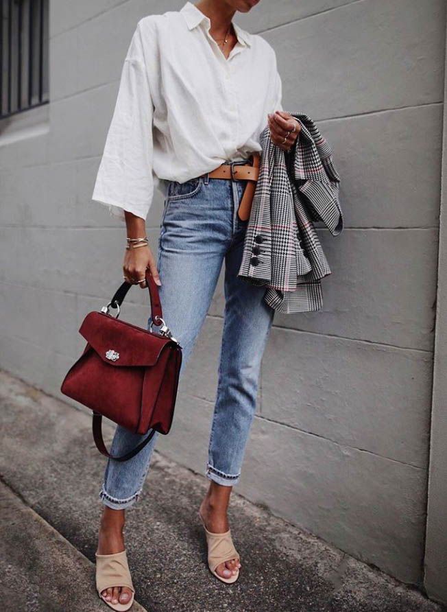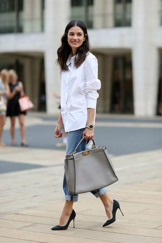 Ідеальним поєднанням на кожен день може бути варіант наряду з класичною білої сорочки, джинсових штанів "варенок", туфель на невеликому каблуці і маленької сумочки. Доповнити такий образ можна сонцезахисними окулярами, кепкою або капелюшком і великими прикрасами.