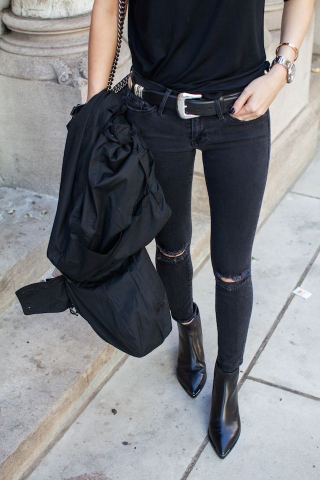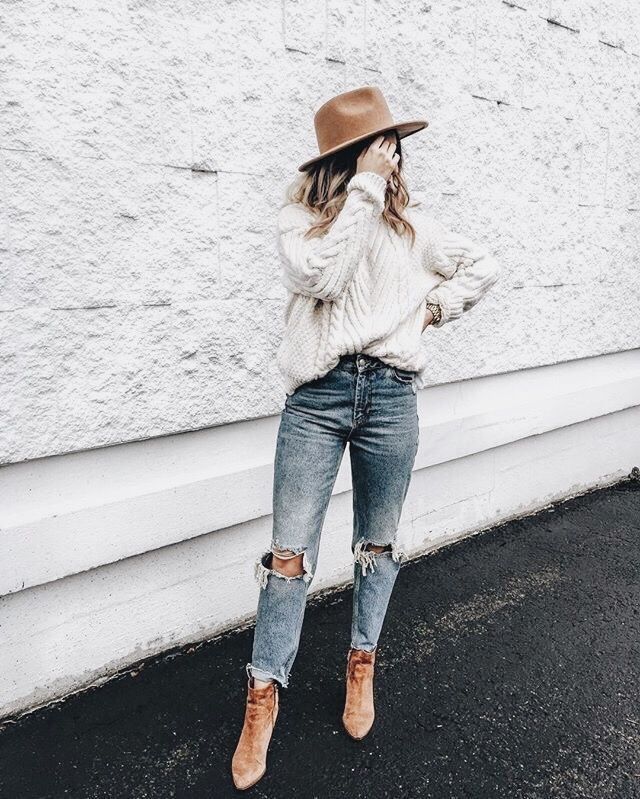 Рвані джинси і півчобітки - прекрасна ідея для осінньої прогулянки або побачення. З таким нарядом можна надіти модний светр оверсайз, капелюх або шапочку бінні і великі прикраси.