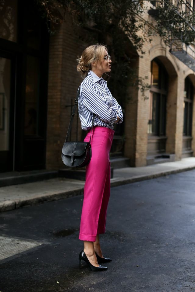 А ось що ідеально підійде для зустрічі з начальством або колегами - штани кольору фуксія. Вони чудово поєднуються з класичною сорочкою і човниками. І виглядають дуже стильно і доречно.