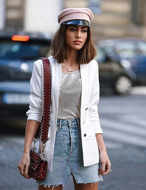 Довжина міні дуже стильно виглядає у поєднанні з різними піджаками. Доповнити образ можна беретом або капелюшком, невеликою сумочкою і класичним взуттям.
