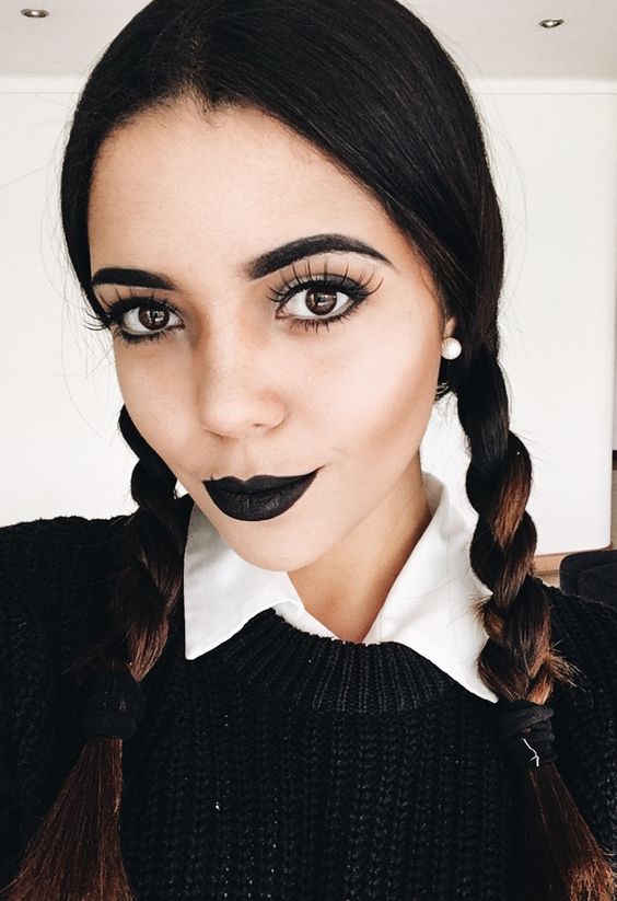 Уэнздей Адамс – старша дочка ексцентричної родини Адамс. Обов'язково беремо максимально світле тональне покриття, а поверх – матуючу пудру з хорошими властивостями, щоб добитися ефекту фарфорової шкіри. Далі виділяємо очі за допомогою чорного олівця та накладних вій. Наприкінці на губи наносимо помаду чорного кольору.