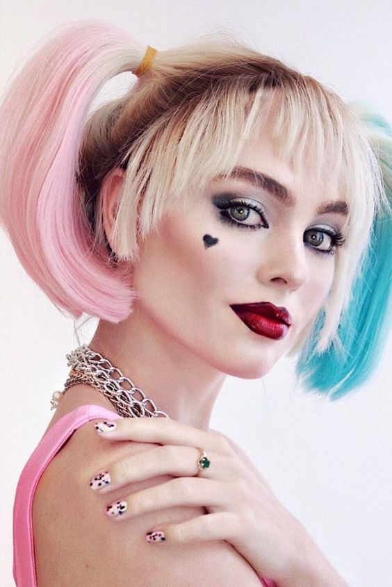 Харлі Квінн – це суперлиходійка, пізніше антигероїня всесвіту DC Comics, що спочатку з'явилася в мультсеріалі "Бетмен" у 1992 році, а пізніше була перенесена в комікси. Щоб відтворити її образ, достатньо за допомогою чорного олівця підвести очі та виділити яскраво-червоною помадою губи. А доповнить макіяж маленьке серце на вилицях.