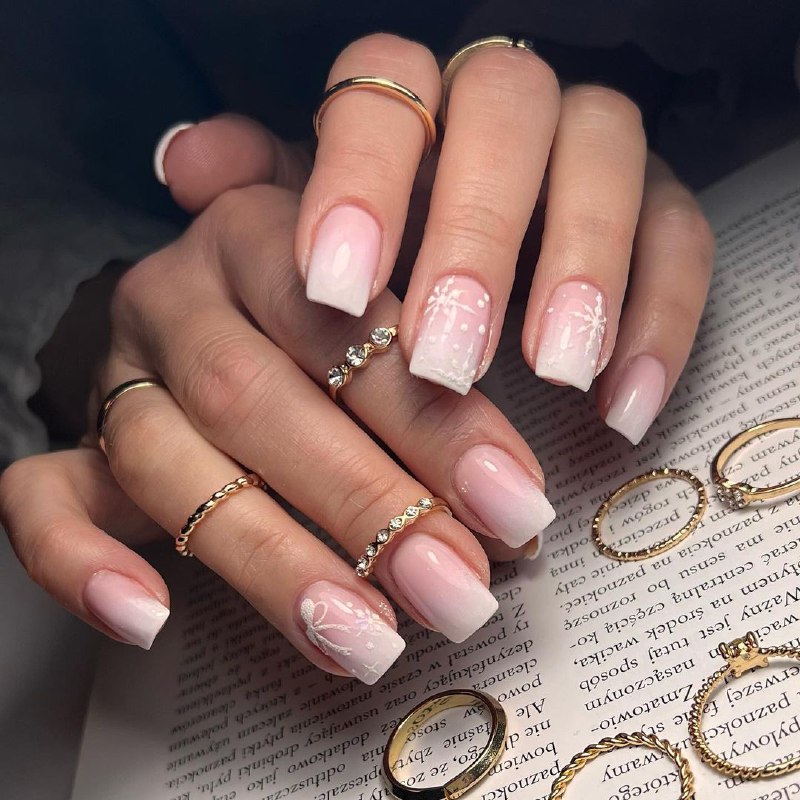 Якщо ви ще не визначилися, який зробити манікюр на Новий рік 2023, вибирайте ніжний френч омбре. Це нова техніка, яка включає створення м'якого градієнта по центру нігтів, що переходить від темнішого відтінку до більш світлого, що дозволяє дизайну дзеркально відбиватися на кінчику френча. Такий варіант зимового манікюру підійде під будь-який образ. А доповнити його можна стемпінгом – тобто перенесенням на ніготь за допомогою штампу малюнка з трафарету.