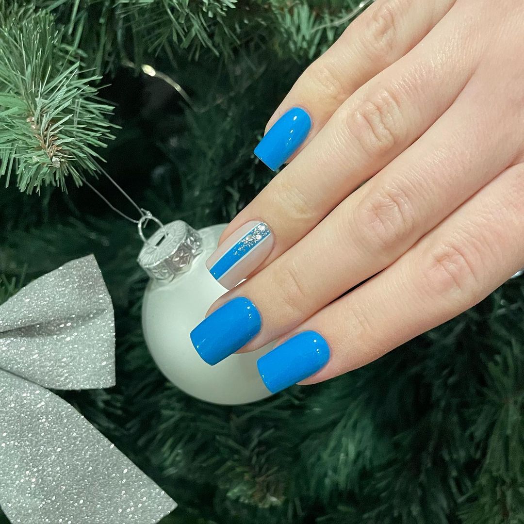 На довгих квадратних нігтях гарно виглядатиме насичений синій відтінок. Один ніготь можна покрити контрастним кольором, наприклад, білим або молочним, і зробити на ньому оригінальний дизайн із вертикальною лінією, малюнком сніжинок та стразами.