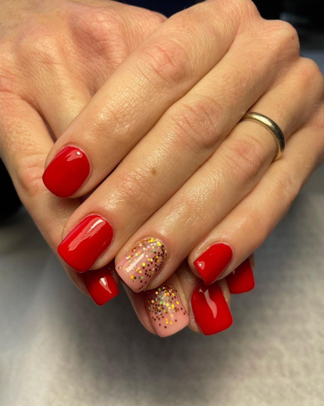 Червоний новорічний манікюр можна урізноманітнити одним нігтем з напівпрозорим покриттям, на який нанести золотисті блискітки.