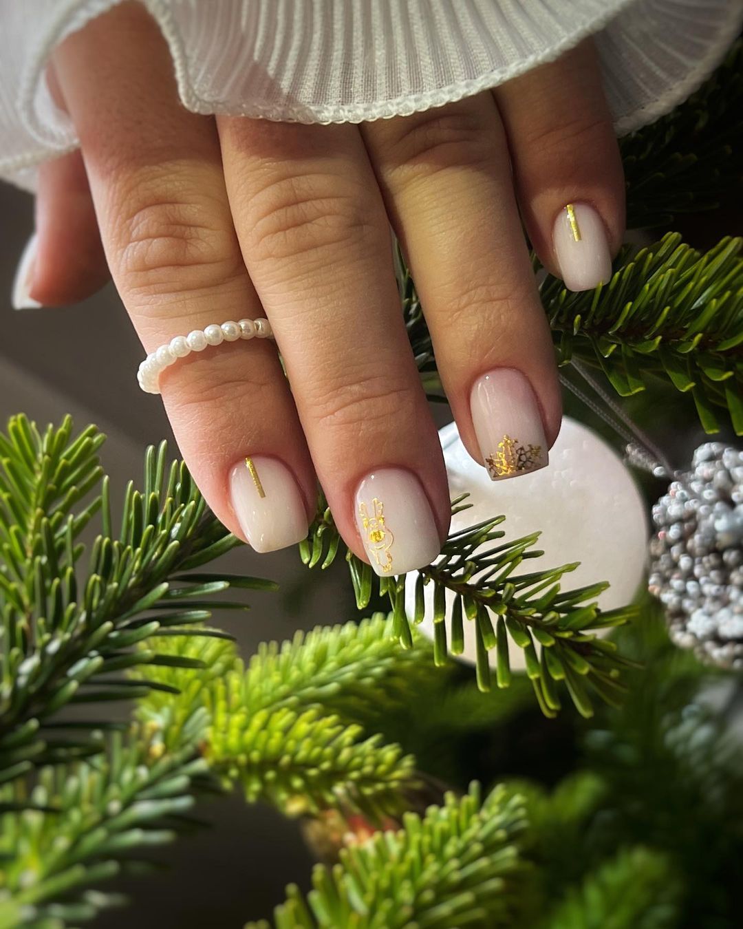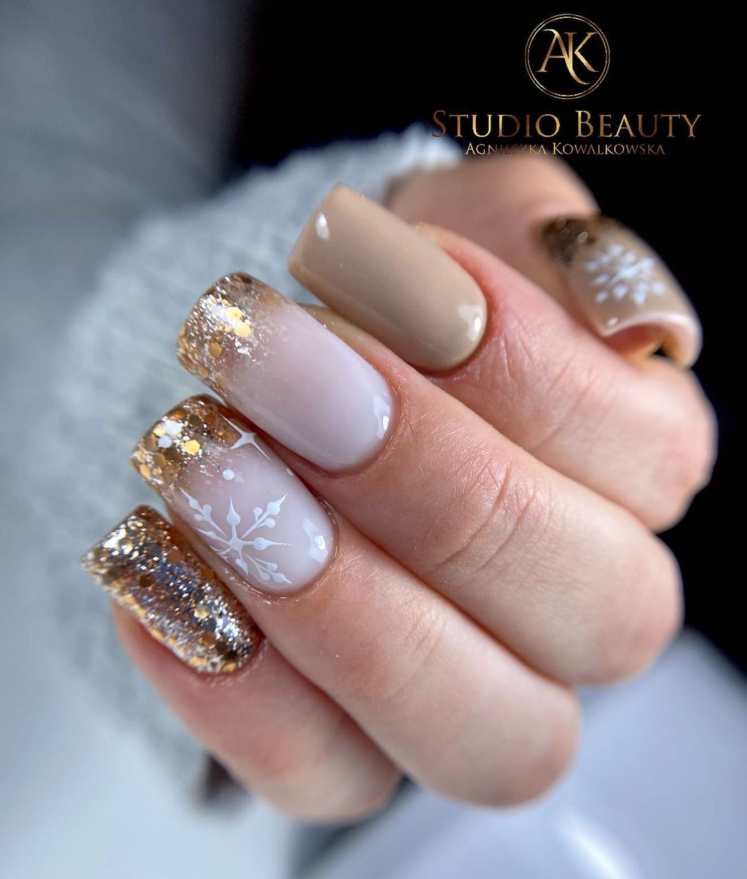 Якщо у вас довгі нігті, покрийте їх частину білим кольором, а на кінчик нанесіть золотисті блискітки, а іншу частину – бежевим. Один ніготь повністю виділіть лаком з великими блискітками. Також такий дизайн можна урізноманітнити зображеннями сніжинок.