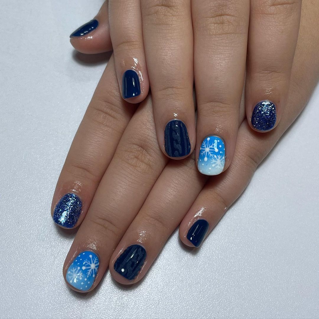 Також можна вибрати для новорічного манікюру синьо-блакитну гамму кольорів. Доповнять такий нейл-арт зображення сніжинок, які можна намалювати від руки або нанести за допомогою спеціальних трафаретів.