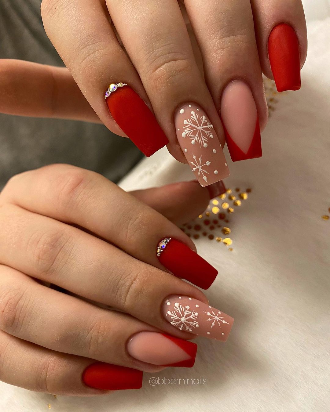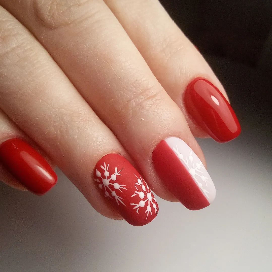 Для багатьох модниць новорічний манікюр – це обов'язково покриття з яскраво-червоним гель-лаком. Однак не варто зациклюватись на однотонному дизайні, поекспериментуйте. Частину нігтів залиште глянсовими, а іншу – матовими. Один ніготь зробіть наполовину червоним, наполовину білим. А на інший нанесіть стемпінг із зображенням сніжинок.