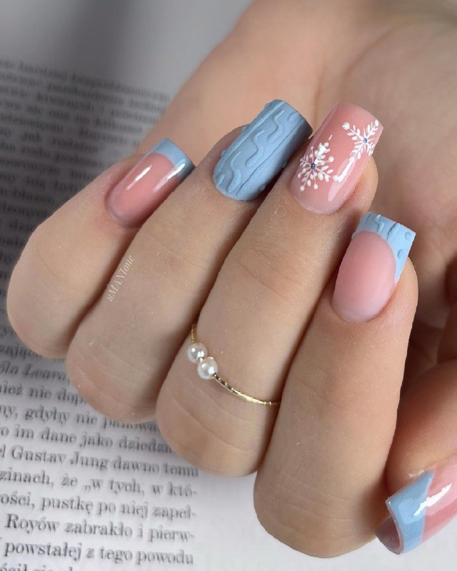 Ще один варіант – поєднати декілька дизайнів, наприклад, французький манікюр із кольоровим кінчиком, об'ємний дизайн, який нагадує велику в'язку, а також малюнки сніжинок з невеликим каменем у центрі.