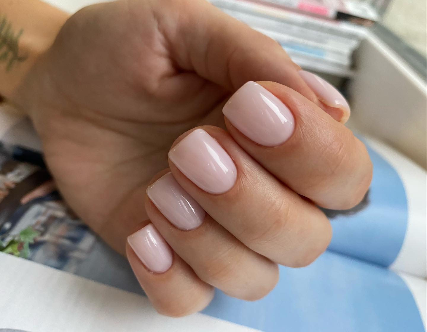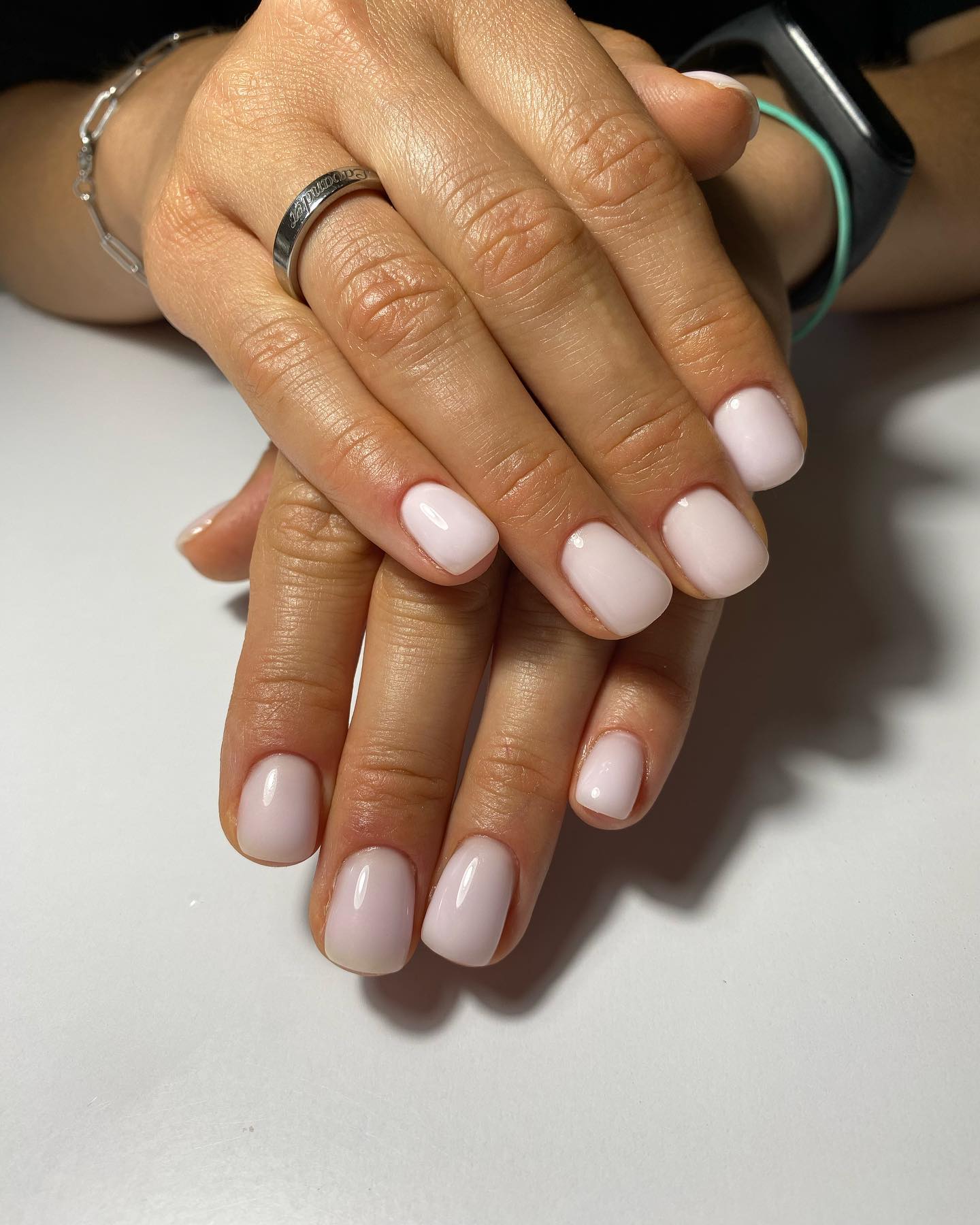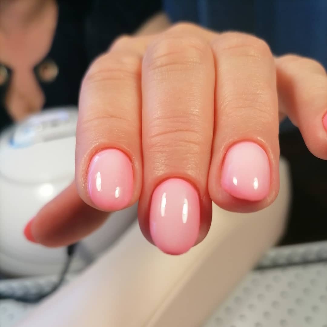 Ще один варіант – рожево-молочний колір. Цей відтінок багатьом нагадує основу для французького манікюру, проте цей тон добре виглядає і самостійно, особливо на коротких нігтях мигдалеподібної форми.