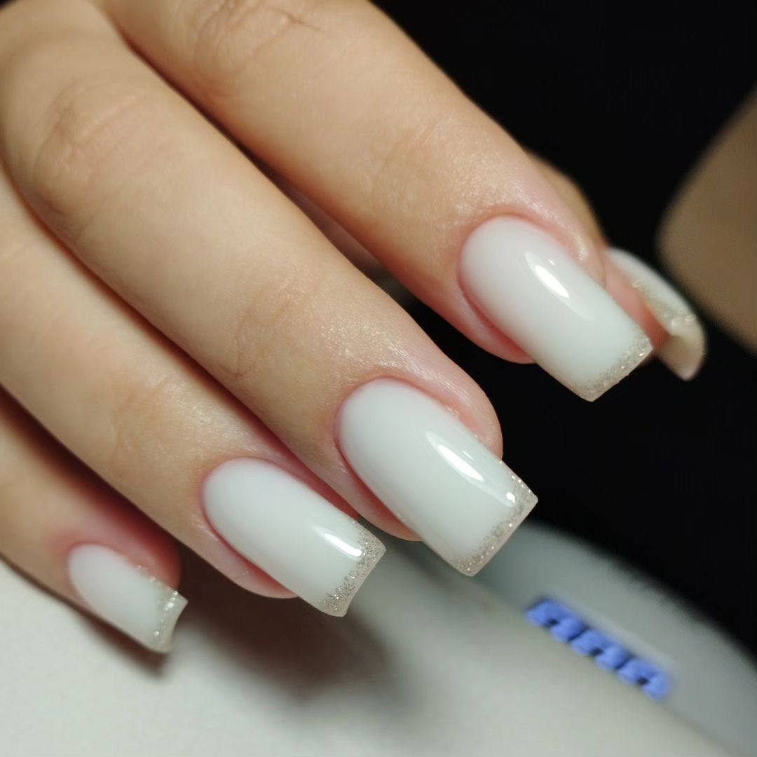 Також можна зробити незвичний французький манікюр. Основу нігтя покрити молочним відтінком, а на кінчик нанести гель-лак зі світловідбивним ефектом та дрібними блискітками. Такий дизайн особливо ефектно виглядатиме при штучному освітленні.