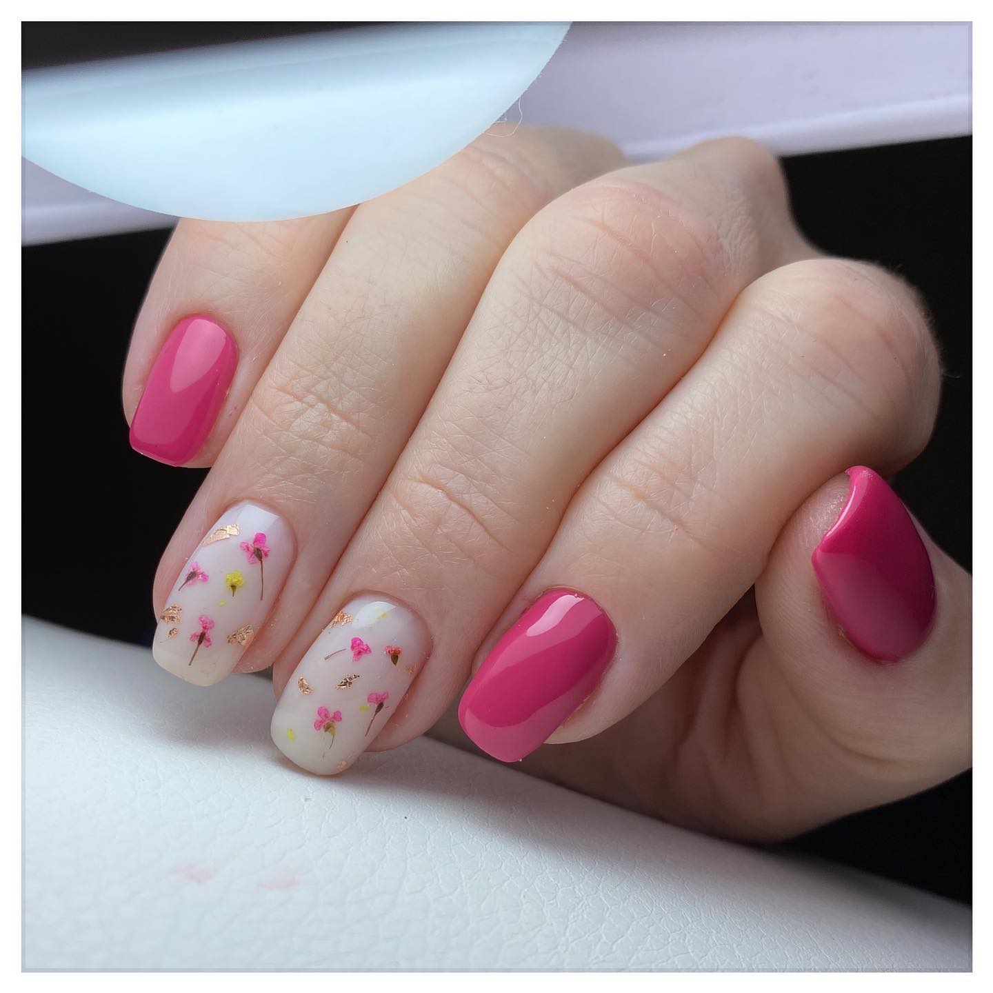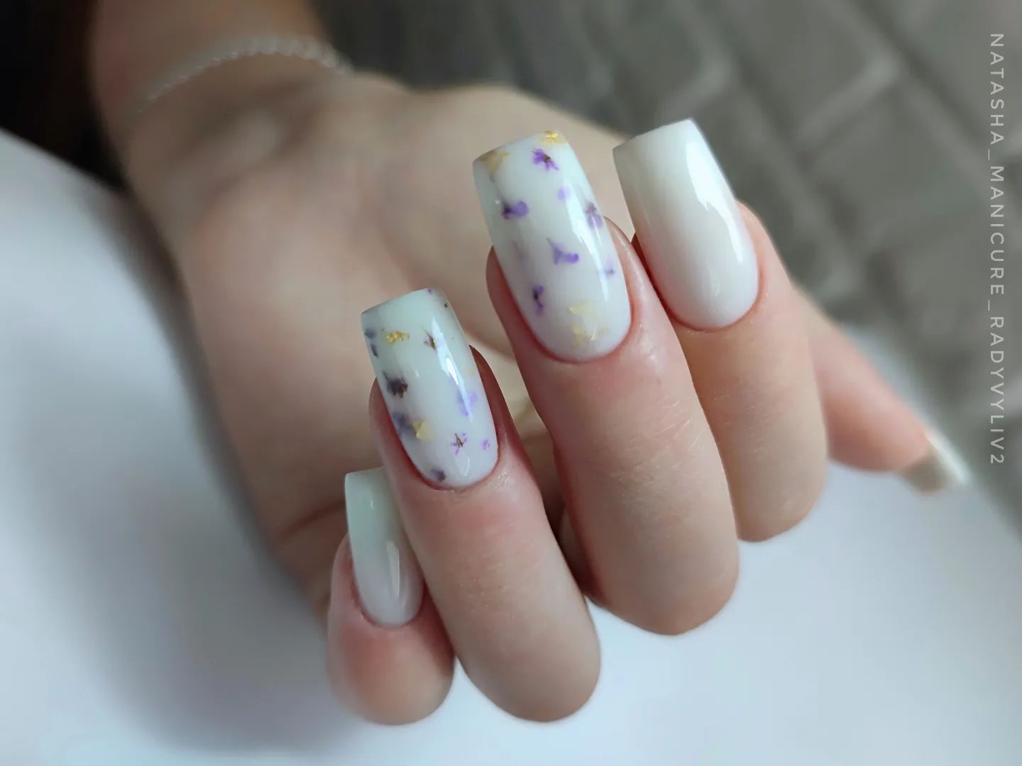 Ще один варіант, чим можна урізноманітнити молочний манікюр – це сухоцвіти. Сухоцвіти – це висушені живі квіти та листя різних форм, кольорів та розмірів. Їх сушать і вирівнюють спеціальним чином, щоб вони могли щільно прилягати до нігтьової пластини та не заважати у повсякденних справах.