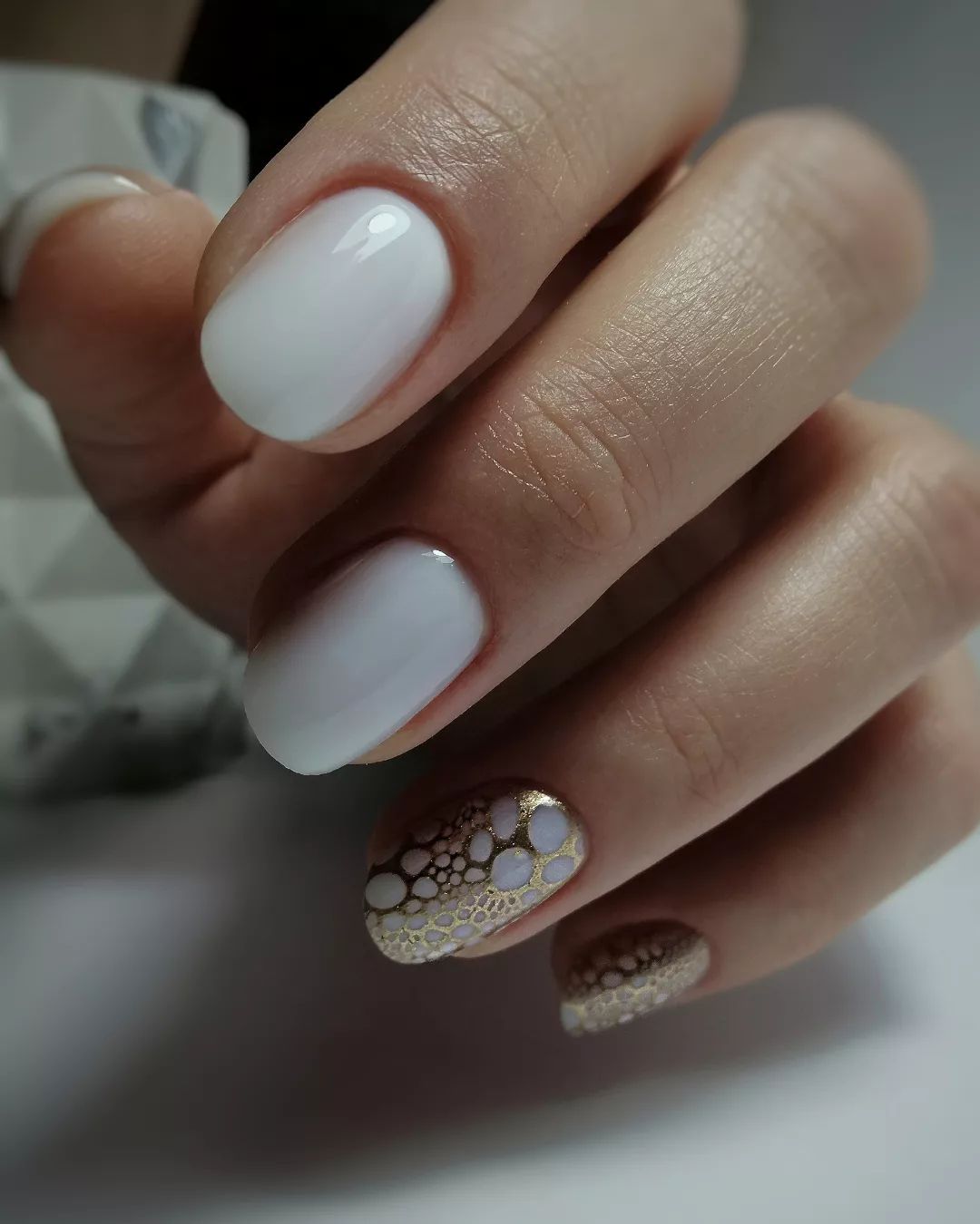 А якщо ви хочете урізноманітнити його, зробіть на одному або двох нігтях дизайн зі стемпінгом тобто з перенесенням на ніготь за допомогою штампу малюнка з трафарету. На молочій основі красиво виглядатимуть як чорні чи червоні елементи, так і золото або срібло.