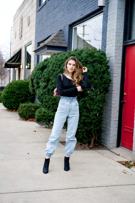 Джогери також можна поєднувати із взуттям на високих підборах. Одягайте однотонний лонгслів або водолазку, джинси з блакитного деніму, а також ботильйони. Доповніть лук невеликою сумкою чи клатчем.