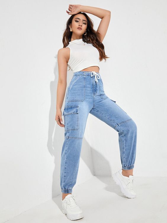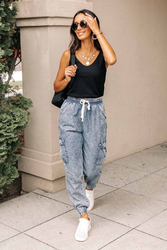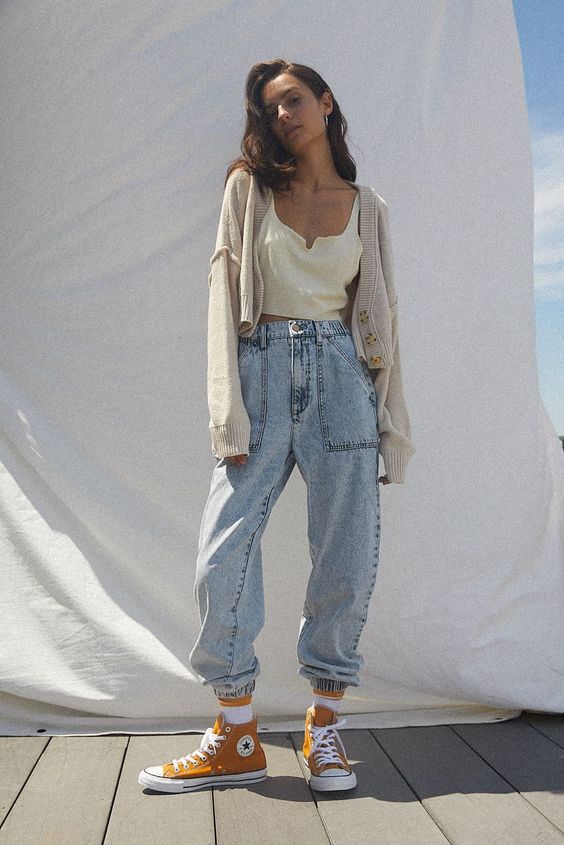 Ще один варіант розслабленого луку: джинси джогери з блакитного деніму, топ і вкорочений в'язаний кардиган. Доповніть лук яскравими кедами.